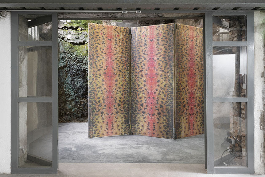 In the grotto featuring rough and vegetated rock, Bruno Silva presents a translucent polycarbonate screen covered with pink bands and rainbow reflections. These repeated transfers of patterns from the trout epidermis establish a strange dialogue with the plastic modules, as it happens with the artificial introduction of this animal species into French rivers. In a subtle game of transparency, this sculpture stands on the border between interior and exterior, shadow and light, visible and invisible, inviting the spectator to walk around it, and playing on the dichotomies inherent to the status of the Grotto in the art center : a space between two spaces at the same time natural and artificial.