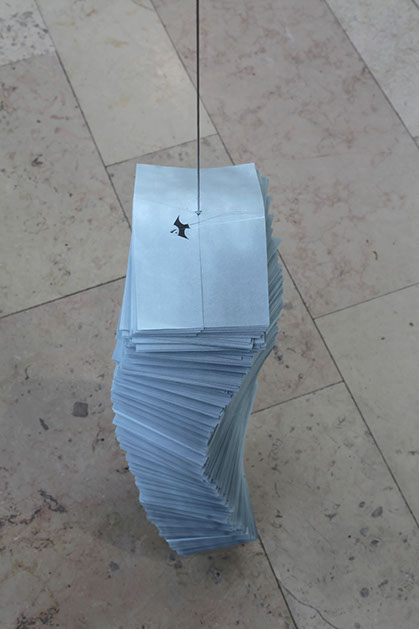 Unnamed_0.1.2.1.1.1.1, 4000 impressions en noir et blanc suspendues par un fil en acier, 17.5 x 9.5 x 700 cm, vue de l'exposition collective " Le Générique du Début", La Serre