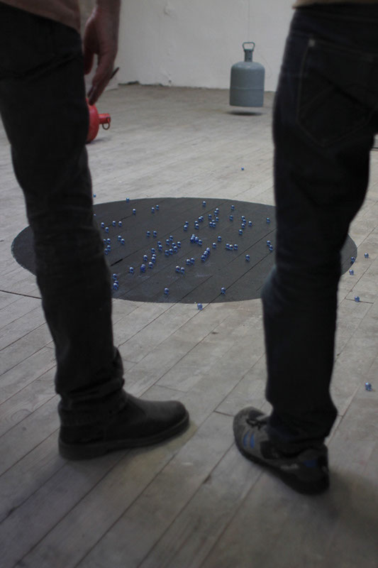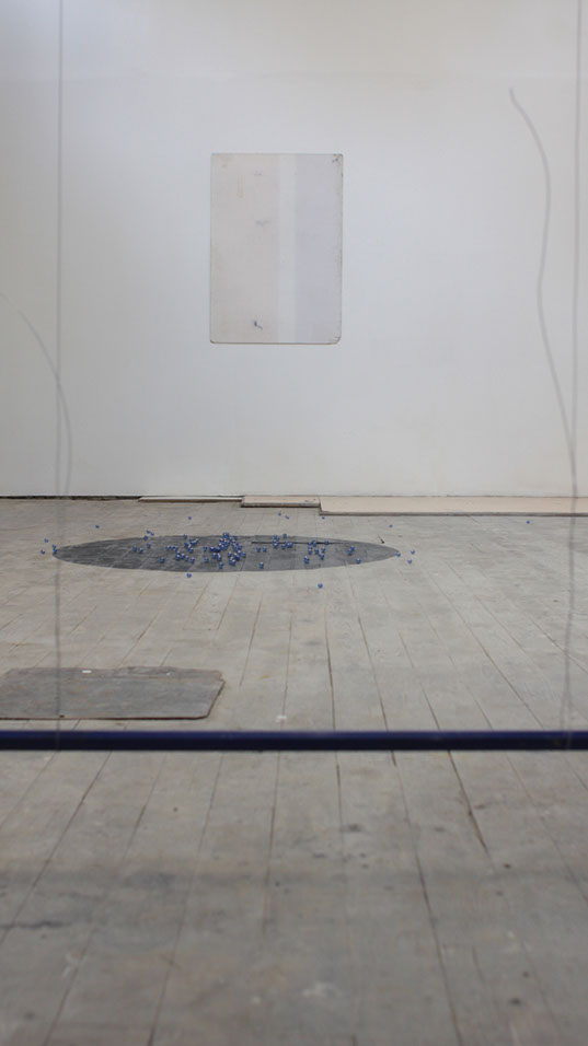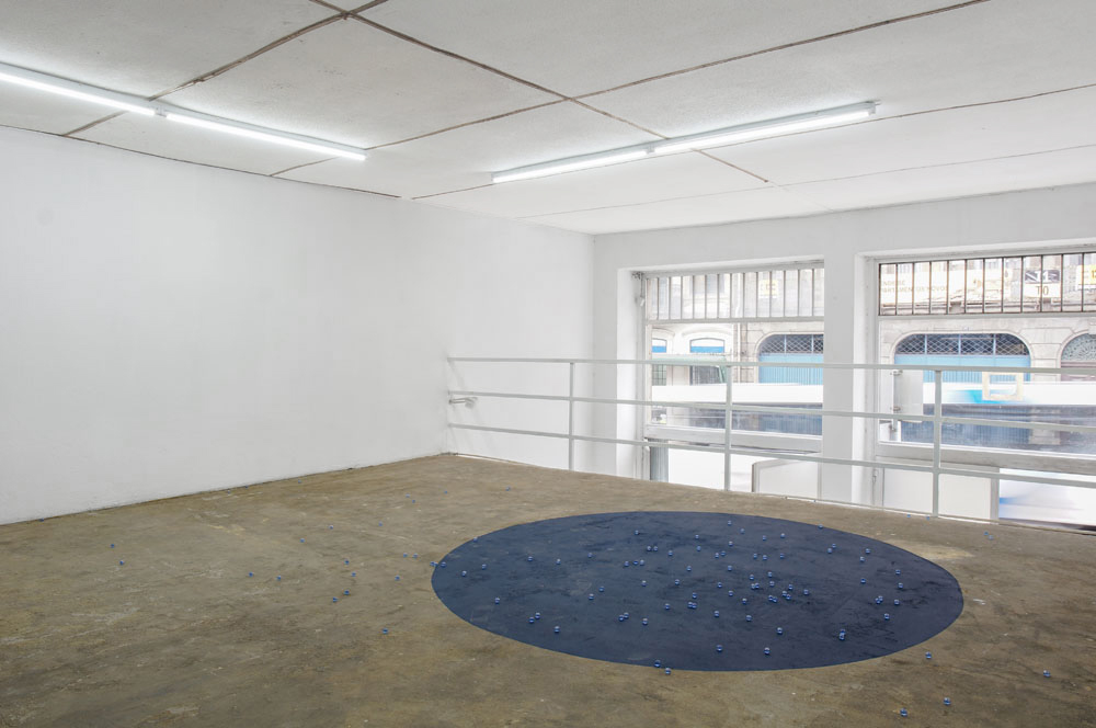 Unnamed_0.1.2.1.1.1.2.1, Peinture bleue, billes bleues, vue de l’exposition 'Na Corda Bamba", espace Rua do Sol 172, Porto, Portugal