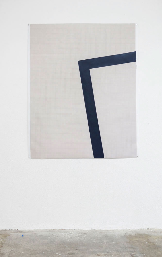 Unnamed_0.1.2.1.1.1.3.3, papier millimétré, bombe bleu indigo, 140 x 110 cm, vue de l’exposition Na Corda Bamba, espace Rua do Sol, Porto, Portugal